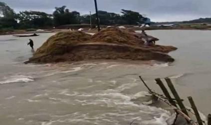 বাঁধ ভেঙে পানি ঢুকছে সুনামগঞ্জের এরনবিল হাওরে